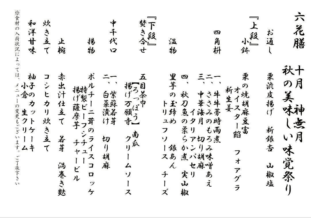 10月の六花膳のご案内です。