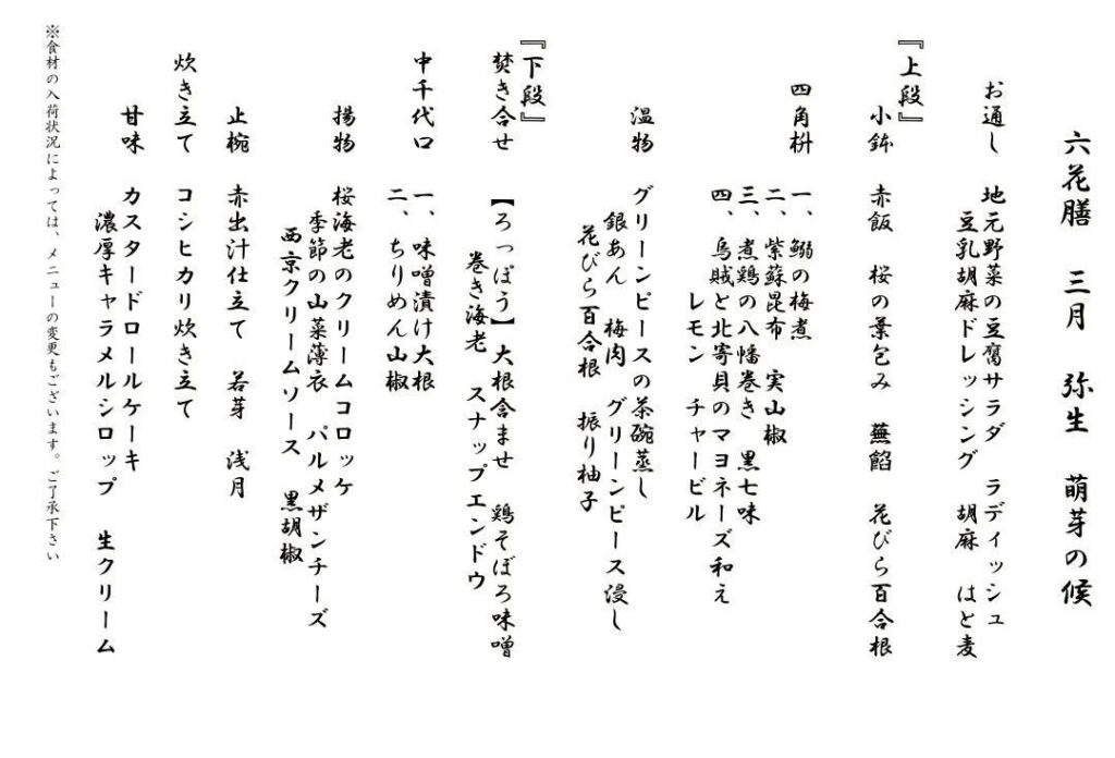 春のやさしい彩りと香りを重ねた、3月の六花のお料理ができました。